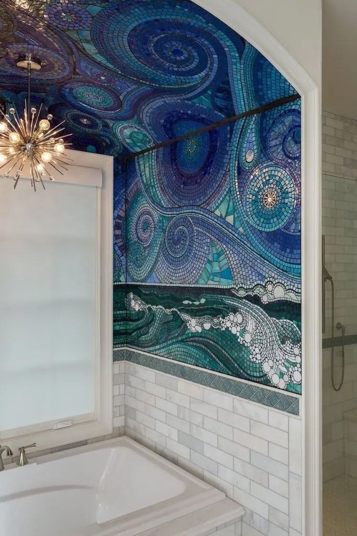 Стеклянную и каменную мозаику благодаря абсолютной водонепроницаемости и высокой ударопрочности плиток практичнее использовать в ванных комнатах, бассейнах, саунах и в других местах, постоянно контактирующих с водой.